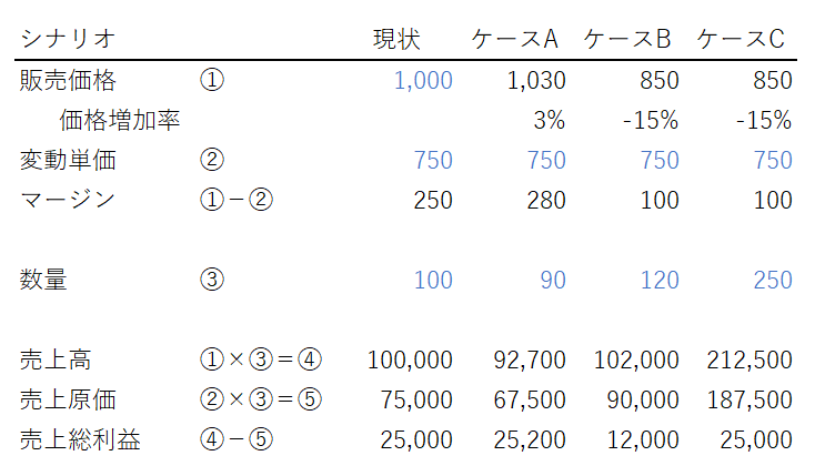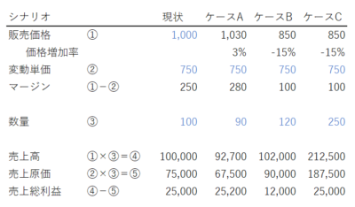 仮に販売価格を3%あげて1,030円にすることが出来るとしましょう(ケースA)。この場合、販売数量が10%ダウンして90個になったとしても、売上総利益は25,200円と現在よりも増益となります。
