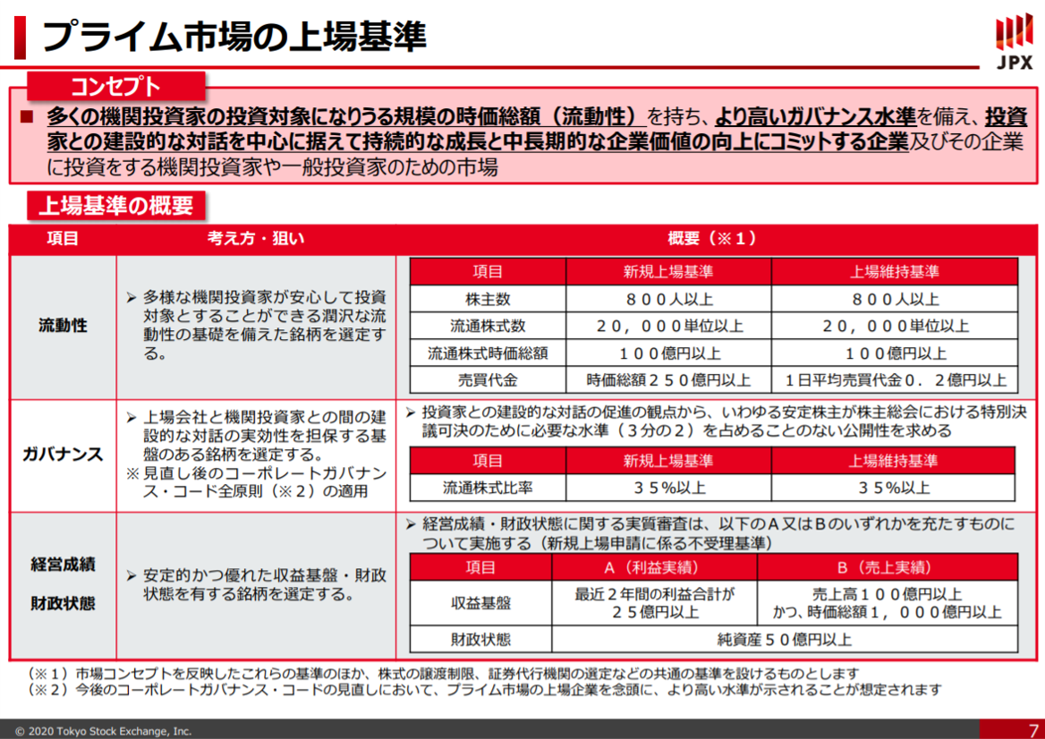 プライム市場に上場するには、流通株式比率35%以上、流通時価総額100億円以上といった条件を満たす必要があります(詳細下図ご参照)。上場基準を厳しくし、業績や時価総額などが一定水準以上の企業がそろうようにします。プライム市場は海外の機関投資家などが投資対象とするような大企業向けを想定しており、企業の質向上を促し、グローバルな投資マネーの呼び込みを狙っています。