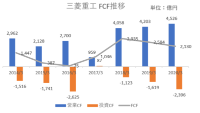 懸念すべきは三菱重工のキャッシュフローです。営業CF、投資CFとそれらを合算したフリーキャッシュフロー(FCF)の推移をみてましょう。