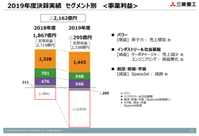 2020年3月期の三菱重工の業績は売上高は4兆413億円と前期比△0.9%とわずかな減収となっています。一方で、事業利益は△295億円と前期の1,867億円から大幅な減益となっています(下図ご参照)。驚くべきことに、国産旅客機「スペースジェット」関連損失の2,633億円が大きく足を引っ張っていることがわかります。「スペースジェット」は度重なる開発の遅れで商用化のめどが立っておらず、三菱航空機は20年3月期に4,646億円の債務超過となりました。