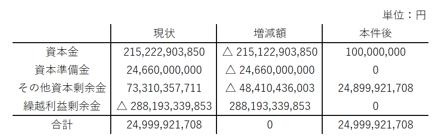 最後に「その他資本剰余金」のうち、288,193,339,853円を繰越利益剰余金に振り替え、繰越利益剰余金の欠損(いわゆる累積損失)を一掃したわけです。いろいろと書いてきましたが、要するに、減資後は次のように変わりますということです。
