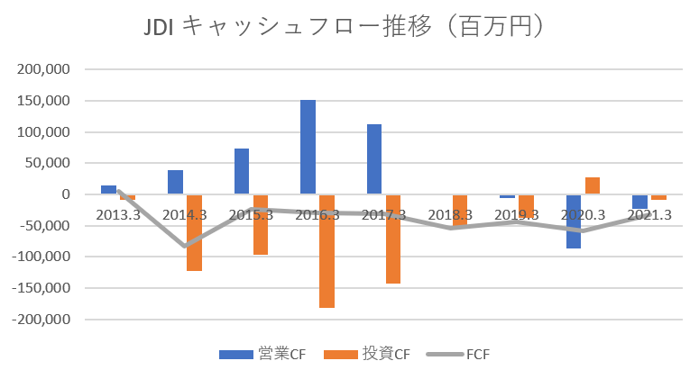 また、キャッシュフローの推移は次の通りです。営業キャッシュフロー(営業CF)はなんと4期連続マイナスです。さらに驚くのは、フリーキャッシュフロー(FCF=営業CF+投資CF)は8年連続マイナスなのです。「累積損失の解消による財務基盤の健全化と持続的な成長に向けた資金確保は当社の中長期的な企業価値向上に資すると考えております」というJDIのコメントが虚しく響きます。資本金1億円以下になれば、税務上では「中小企業」と扱われ、一定の優遇措置が受けられますが、まさかそれを狙ったのでしょうか。蓋然性の高い復活ストーリーなき、資本金1億円への減資はむしろネガティブな印象しかありません。