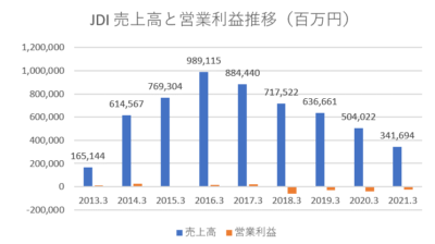 JDIの売上高と営業利益は次のような推移となっています。売上高はまさに雪崩のごとく、下降トレンドを描いています。2022年3月期の売上高は2,970億円、営業利益は△131億円と予測していますから減収増益といえど、今だ黒字化は見えてきません。