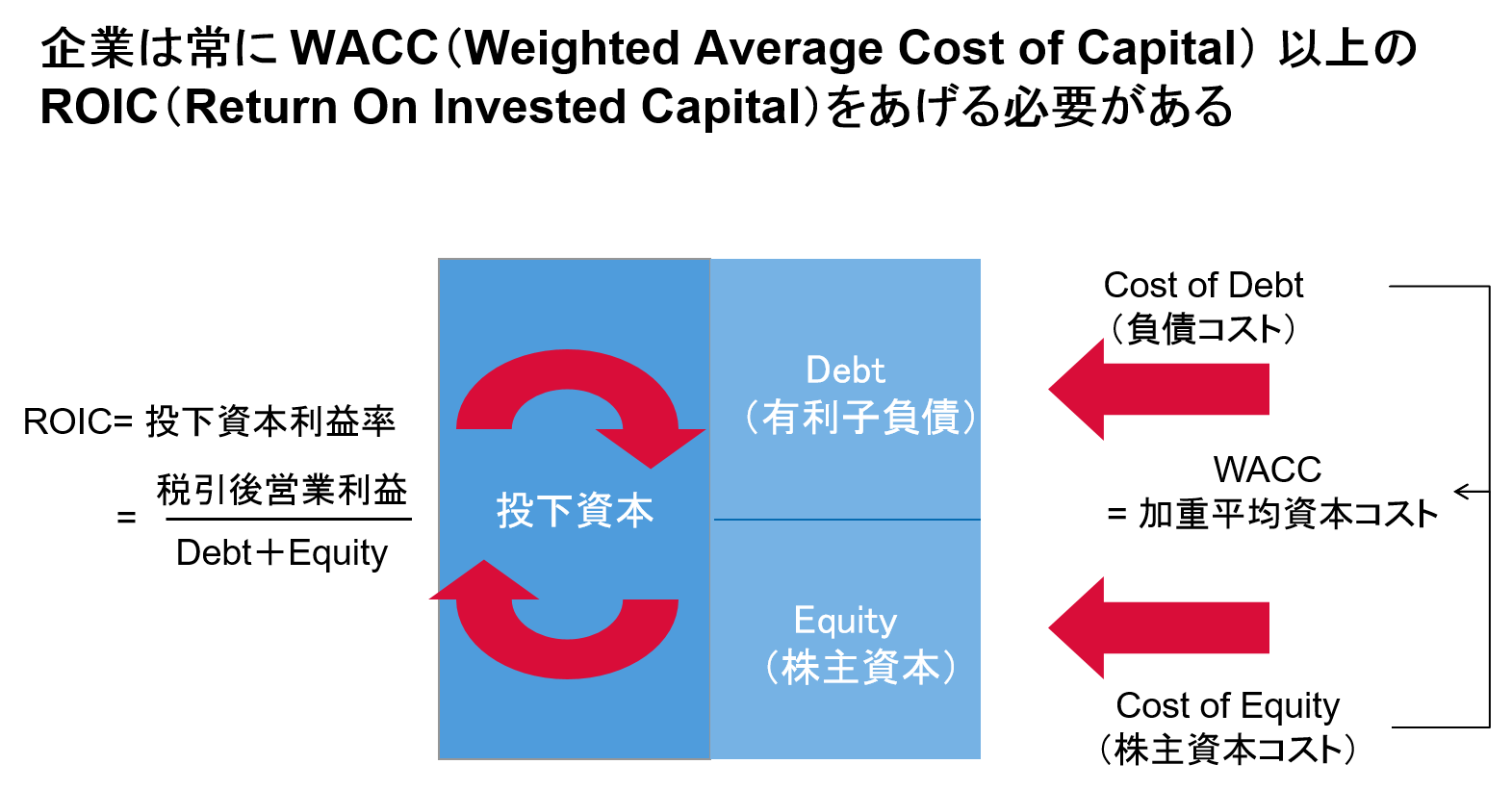 こうすると、企業としてはWACCを上回る投下資本利益率(Return On Invested Capital :ROIC)をもたらす事業のみに投資をすることが重要であるとわかります。経営者としては、限られた投下資本の中で、ROICとWACCのスプレッド(差)を最大化することが大切ということです。