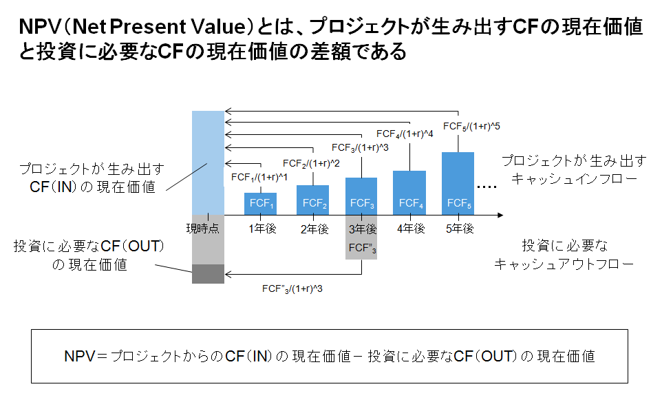 言い換えれば、あるプロジェクトが将来生み出すキャッシュフローの現在価値(キャッシュインフローの現在価値)と、プロジェクトに必要なキャッシュフローの現在価値(キャッシュアウトフローの現在価値、つまり投資額)を比べ、前者のほうが大きい場合は「投資すべき」となります。この両者の差、すなわち「キャッシュインフローの現在価値」から「キャッシュアウトフローの現在価値」をマイナスしたものをNPVと言います。