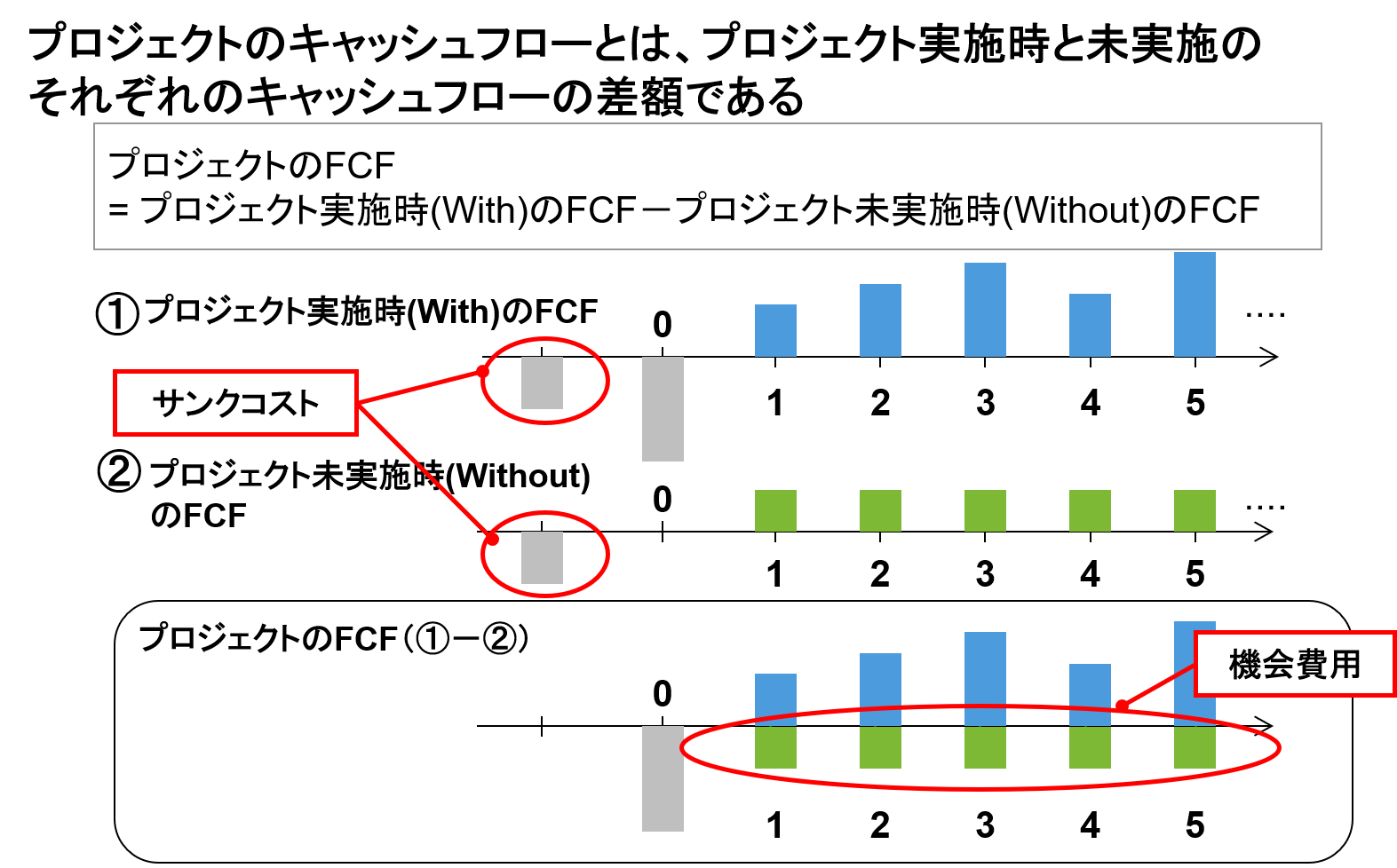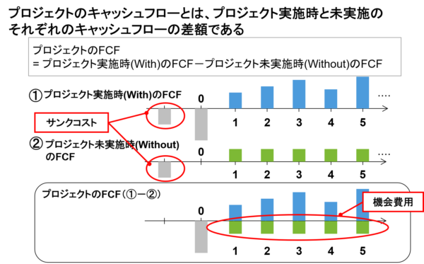いまだに、投資した場合(With)のキャッシュフローでNPVやIRRを計算している会社があと立ちません。投資判断のキャッシュフローは、プロジェクトを実施した場合「With」のキャッシュフローから、プロジェクトを実施しない場合「Without」のキャッシュフローを差し引かないといけないのです。