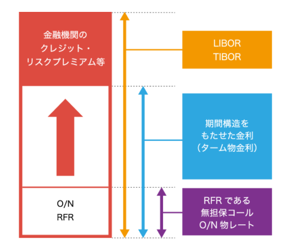 日本円におけるリスクフリーレート(RFR)に該当するのがこのTONAです。日本では「無担保コール翌日物金利」と呼ばれています。金融機関同士がコール市場で、無担保で貸し借りを行うときの金利です。翌日物とあるように翌日には返済されます。翌日物という特徴から期間構造を持たせた金利や金融機関の信用リスク(クレジット・リスクプレミアム等)を含みません。この点で、信用リスクが含まれ、3ヵ月や6ヵ月などの期間構造を有するLIBORやTIBORとは異なります(下図参照)