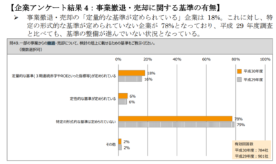 前回のブログ「迅速な経営判断の難しさ」では事業の撤退の難しさを取り上げました。難しいからこそ、撤退基準をあらかじめ決めておくのが大事といいました。ところが以下のアンケート結果のように、事業撤退・売却の「定量的な基準が定められている」企業は 18%なのが実態なのです。