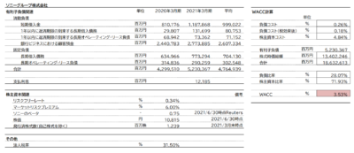 それでは、EVA(経済的付加価値)の観点から、ソニーの企業価値創造がどうなっているか見てみましょう。EVA(経済的付加価値、Economic Value Added)はスターン・スチュワート社の登録商標で、企業が一定期間にどれだけの価値を創造したかをみる指標です。言い換えれば、資本コスト以上の税引後営業利益を生み出しているかをみる指標とも言えます。ここでは、ざっくりEVAを計算してみましょう。ソニーのWACCは、3.53%と推定できます(下図ご参照)。