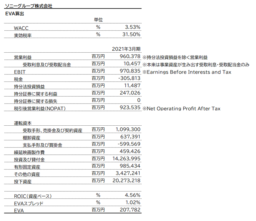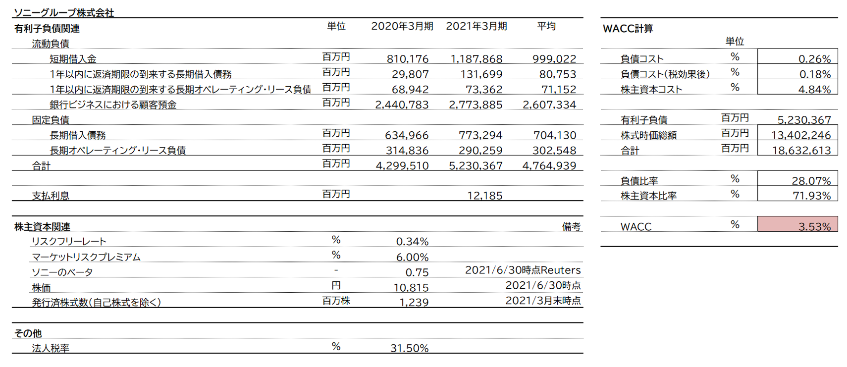 それでは、EVA(経済的付加価値)の観点から、ソニーの企業価値創造がどうなっているか見てみましょう。EVA(経済的付加価値、Economic Value Added)はスターン・スチュワート社の登録商標で、企業が一定期間にどれだけの価値を創造したかをみる指標です。言い換えれば、資本コスト以上の税引後営業利益を生み出しているかをみる指標とも言えます。ここでは、ざっくりEVAを計算してみましょう。ソニーのWACCは、3.53%と推定できます(下図ご参照)。