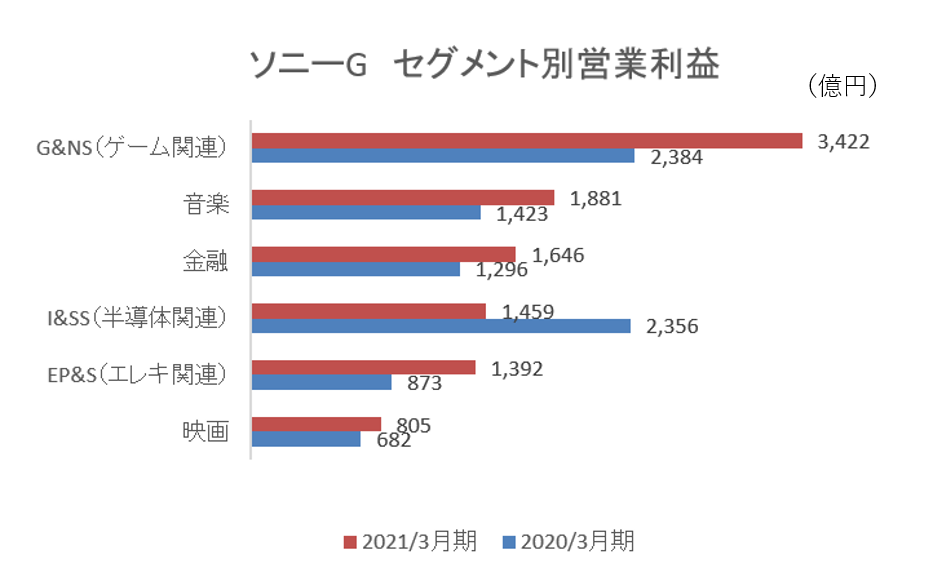 好業績の要因は祖業のエレクトロニクス事業ではなく、ゲームや映画、音楽などのエンタメ部門にあります。セグメント別の2021年3月期のゲームと音楽、映画などエンタメ部門の売上高は単純合算で4兆3550億円、営業利益も6108億円に達しています。