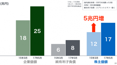 孫社長は、さらに株主価値について言及します。企業価値から純有利子負債を差し引いた株主価値は12兆円から5兆円増加して、17兆円となった。世の中の評価、つまり時価総額は9兆円だけれども、ソフトバンクの金の卵の価値は17兆円になったとこう言っているわけです。
