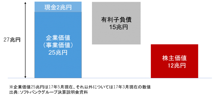 2017年3月期におけるソフトバンクグループ連結での「現金及び現金同等物」は2兆円あります。これに対して、「有利子負債」は15兆円あります。したがって、ソフトバンクグループの企業価値は、事業価値25兆円と非事業資産価値である現金2兆円を合算した27兆円となります。そこから、債権者価値である有利子負債15兆円をマイナスすれば、株主価値が12兆円であることが分かります。