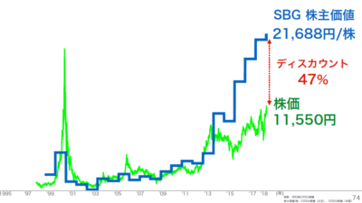 孫氏は市場の評価以上に我々は実力をつけてきたと言っています。23兆円の株主価値に対して、12兆円の時価総額だということは、市場はSBGの価値を47%のディスカウントしていることになります(上図は1株当たりで表現)。株主価値23兆円が正しいとするならば、12兆円でSBGを買収して即座に保有株式を売却すれば、12兆円+利息を金主に返済したとしても、10兆円近くのキャッシュが手に入ることを意味します(買収プレミアムなどを考慮しないと仮定)。