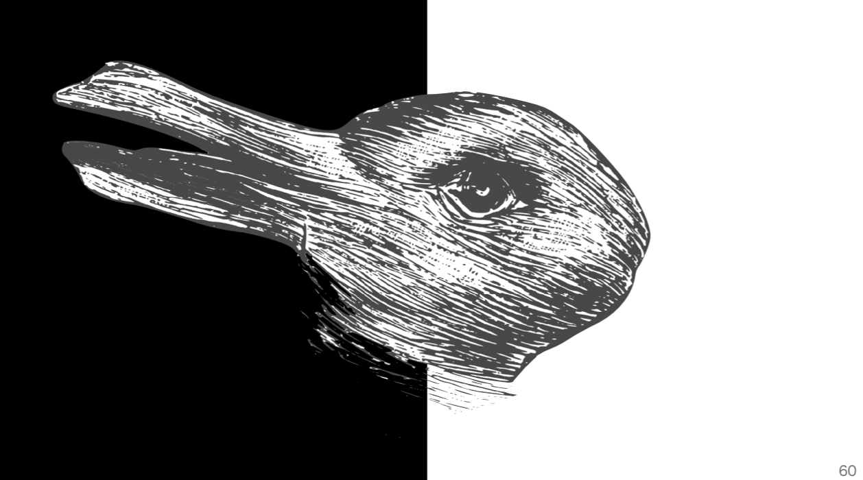 「この1枚の絵をみていただきたい。みなさんには何に見えるでしょうか。左からみれば、アヒルに見える。右から見るとウサギに見える。同じ生き物でも違って見えます。」