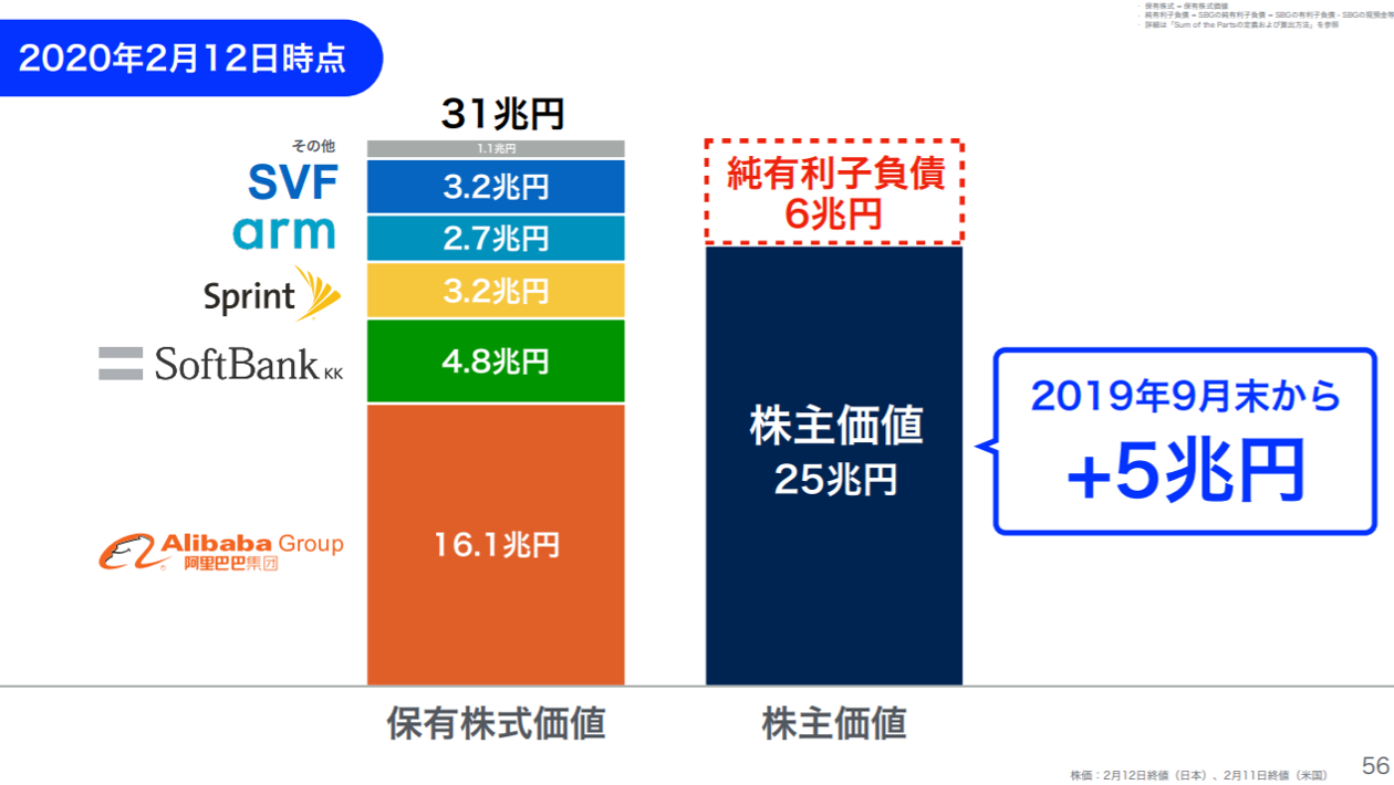 今回も孫社長のメッセージは「会計上の営業利益よりも、株主価値の方が重要である」です。実際のところ、営業利益は▲130億円の赤字でも、ソフトバンクGの株主価値は2019年9月から5兆円増えているのです。確かに理にかなっています。