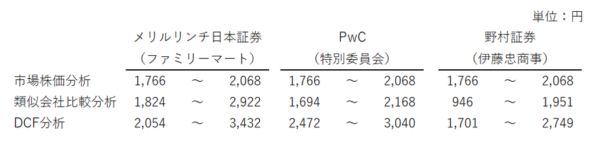 ファミマのアドバイザーのメリルリンチ日本証券は、類似上場企業として株式会社セブン&アイ・ホールディングス、株式会社ローソン、株式会社ニトリホールディングス、株式会社パン・パシフィック・インターナショナルホールディングス、ウエルシアホールディングスおよび株式会社ツルハホールディングスを選定しています。マルチプル(倍率)は、PER(時価総額/当期純利益)倍率を使って1824円~2922円と算定しています。