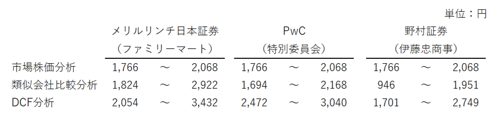 いずれの要求も伊藤忠は、はねのけました。当事者のファミマは、買付価格2,300円を一定の合理性があるとしながらも、一般株主に対し積極的に推奨できる水準の価格ではないと発表していました。ファミマはあくまでも株主に判断をゆだねるという中立の立場をとったのにはわけがあります。実は買付価格はファミマの特別委員会の評価額を下回っていたからです。今回、買付価格の中立性を担保するためにファミマ、特別委員会、それに伊藤忠は第三者に評価を依頼しています。