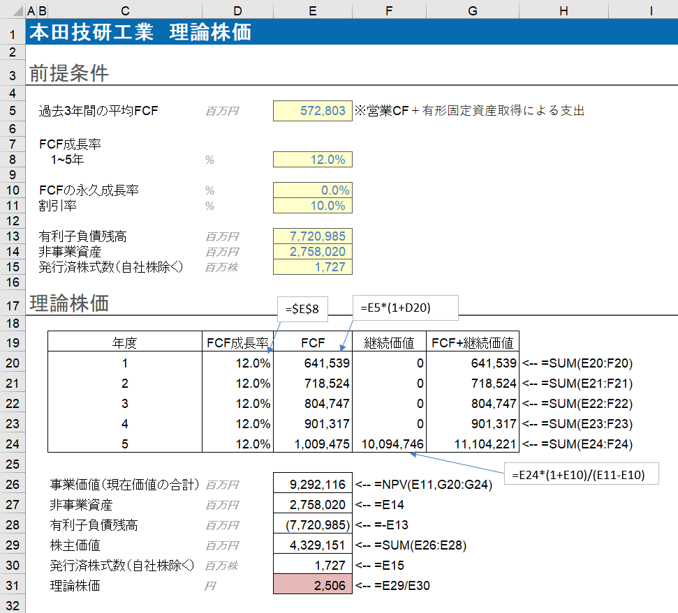 それではお待たせしました。リバースDCF法とは理論株価が現在の株価になるように前提条件(FCF成長率)を逆算するものです。具体的にやってみましょう。ホンダの現在の株価は3382円(2020年9月6日)です。しかし、FCF成長率を12%、割引率を10%とした場合のホンダの理論株価は2506円(Excel図セルE31)になりました。