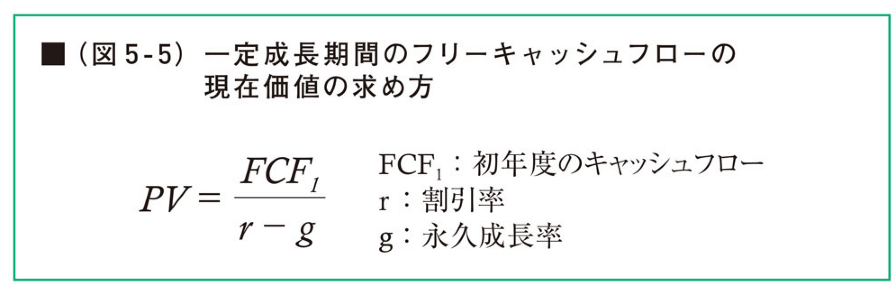 最後に継続価値の算定です。このモデルでは6年目以降のフリーキャッシュフローは一定成長で伸びていくと考えています。この期間を「一定成長期間」と呼び、この期間のフリーキャッシュフローの現在価値の合計を継続価値といいます。一定成長期間のフリーキャッシュフローの現在価値は以下の成長型永久債の現在価値(PV)の公式を使いします。
