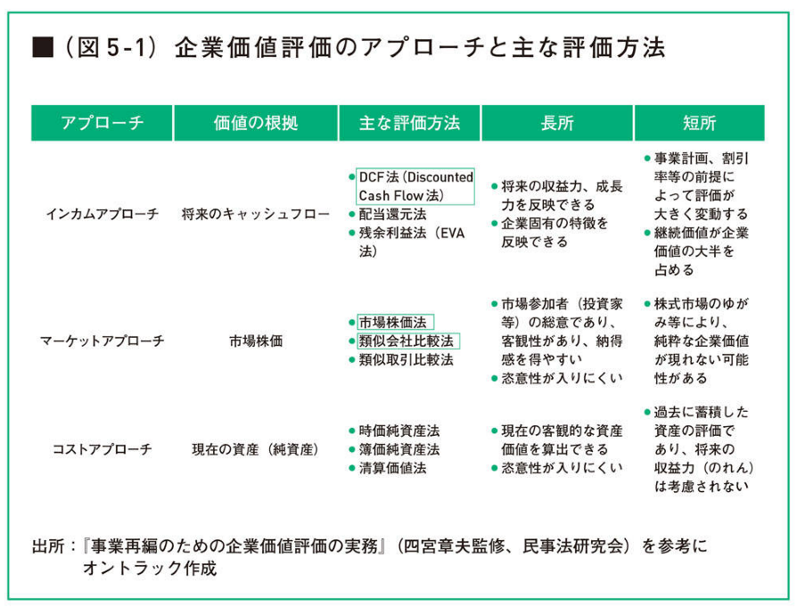 企業価値評価の方法は、一般的にインカムアプローチ、マーケットアプローチ、コストアプローチの3つに分類されます。各アプローチには複数の算定方法があります。実務でよく使われるのは、インカムアプローチのDCF法(Discounted Cash Flow法)、そしてマーケットアプローチの市場株価法と類似会社比較法です。
