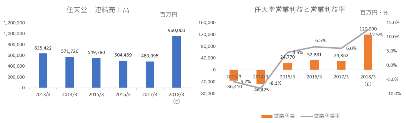 任天堂は、今期のハードウェアの販売台数を1,400万台、ソフトウェアの販売本数を5,000万本と上方修正しています。また、2018年3月期の連結売上高は9,600億円、営業利益は前期比4倍の1,200億円と予想しており、営業利益率がなんと12.5%だというのですからすごいものです。