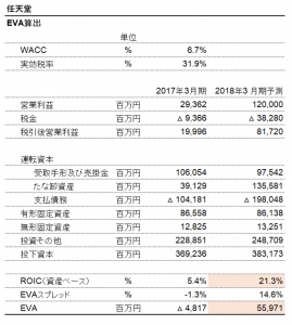 2018年3月期(予測)だとどうでしょうか。投下資本は2017年第二四半期末の数字が入力されていますが、これが2018年3月期末でもほぼ変わらないとするとEVAはなんと約560億円となります。ROICが前期5.4%から21.3%に大幅上昇です。任天堂はまさに企業価値を創造し始めたといえるわけです。