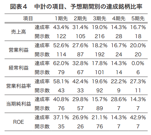 この論文では、なんと中計の達成率まで分析しています。中計の達成率は予想期間が長くなれば低くなるのは当然としても、中計で予想されることの多い3期先の達成率はROE以外は20%もいかず、とても低いことがわかります。企業が達成可能な現実的な目標設定をしているとは考えられません。