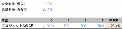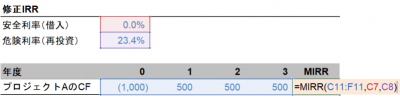 このMIRR関数は、安全利率(借入)と危険利率(再投資)と名前は分かりにくいのですが、危険利率として再投資の利率を設定することが出来ます。当然のことながら、再投資の利率を23.4%に設定すれば、修正IRRも23.4%になります。