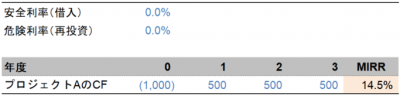 仮に再投資することが出来なかった(=再投資の利率がゼロ)場合は、修正IRRは14.5%に落ち込むことになります。