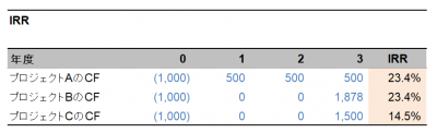例えば、0年度に1,000という投資を行い、3年間にわたって500というキャッシュインがあるというプロジェクトAは、3年目に1,878のキャッシュインがあるプロジェクトBと同じ内部収益率23.4%になります。