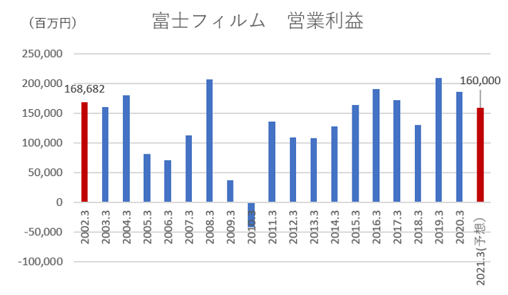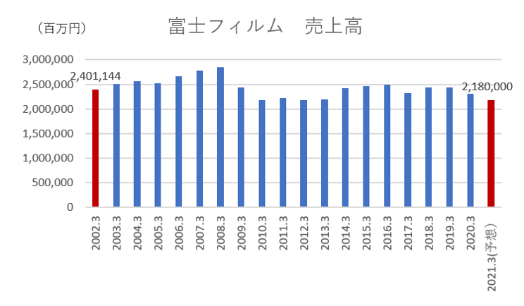 現在の富士フィルムの原型が固まってから1年後の2002年3月期の同社の連結売上高は2兆4011億円。これに対して、2020年3月期における同社の売上高は2兆3151億円で、20年間近くたって売上は成長どころか、減少しています。さらに2021年3月期の売上予想は2兆1800億円と落ち込みます。