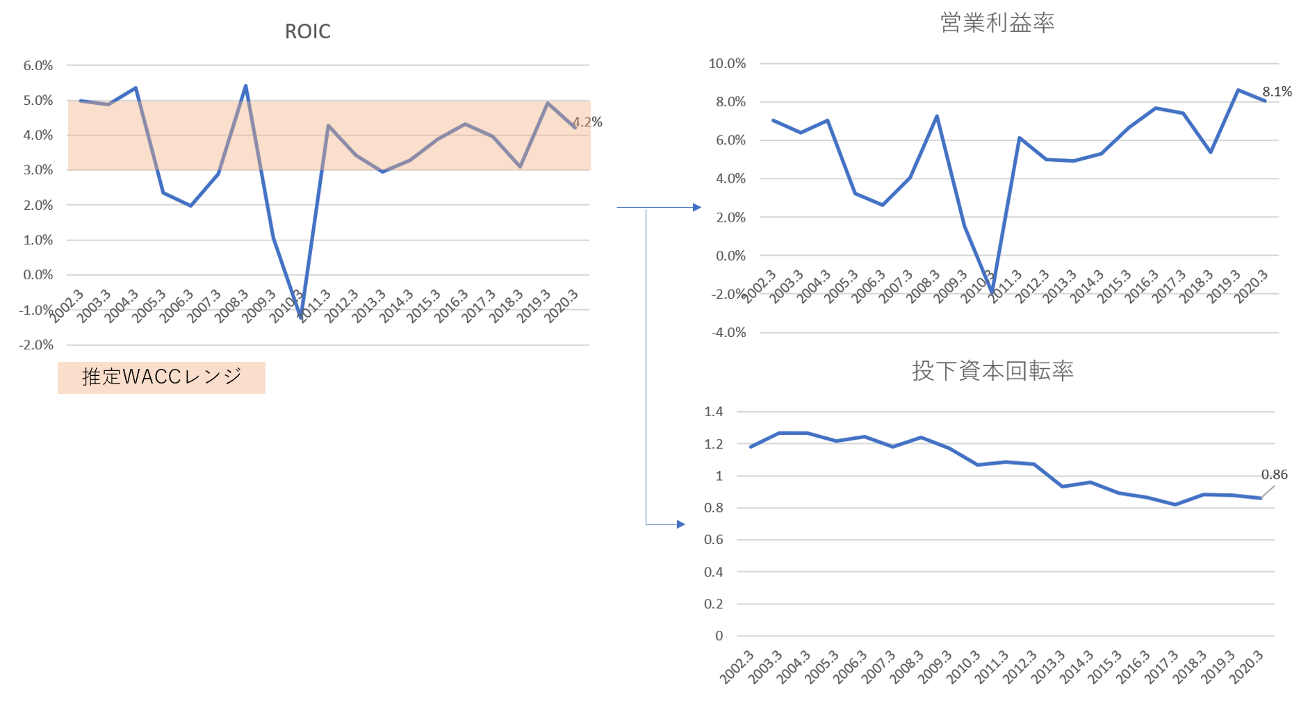 ROICは営業利益率と投下資本回転率に分解できます。営業利益率はまさにROICの動きと連動するかのようなグラフとなっています。2020年3月期の営業利益率は8.1%です。2021年3月期の営業利益率の予想は7.3%ですから、ROICもさらに落ち込むと予想できます。投下資本回転率は売上高/投下資本で計算できます。つまり、投下資本回転率とは、投資資本をどれだけ効率的に売上に結びつけられているかを表す指標と言えます。気になるのは、投下資本回転率がこの20年間下降トレンドを描いていることです。これは、売上高に結びつくような資本投下が行われていないことを示しています。