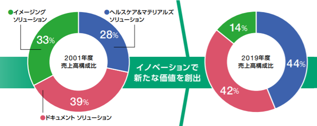 その結果、富士フィルムの事業ポートフォリオはこの20年近くで大きく変化しました。売上の三分の一を占めていた写真に関連する製品・サービスを提供する「イメージング ソリューション」(下図緑色)の割合はいまや14%となり、それにとって代わったのが同社の重点事業分野である「ヘルスケア」「高機能材料」をはじめとした「ヘルスケア&マテリアル ソリューションズ」(下図青色)です。