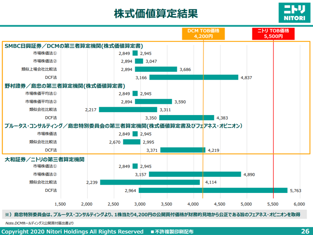 株主価値算定結果をみると、ニトリがつけた5500円のTOB価格が突出して高いように見えます。「お値段以上」のニトリが、島忠の「価値以上」のお値段をつけていないとも限りませんが、一方のDCMは現在のところ、TOB価格4200円を維持する方向のようです。