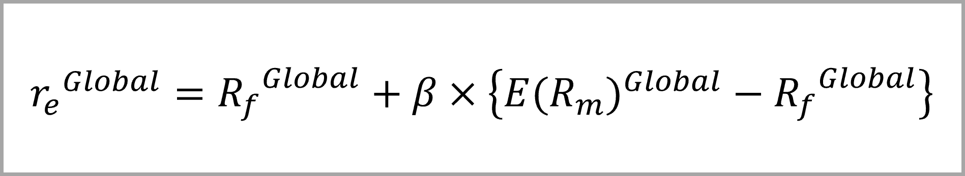 したがって、新興国企業の株主資本コストは、グローバルCAPMで算定された株主資本コストに一定の修正を加えることによって算定するのが一般的です。まずは、グローバルCAPMの構成要素を見ていきましょう。グローバルCAPMは次のようにあらわすことができます。