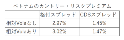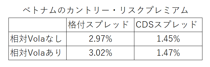 それでは、デフォルトスプレッドの話に戻ります。例えば、ベトナムのMoody’sの格付Ba3に対応するデフォルトスプレッドは2.97%です。また、CDSのスプレッド(但し米国のスプレッド差引後)は1.45%になっています。この数字もダモダラン教授は年2回アップデートしてくれています。Damodaran Onlineのこのファイルをダウンロード。シート名は”ERPs by country”です。
