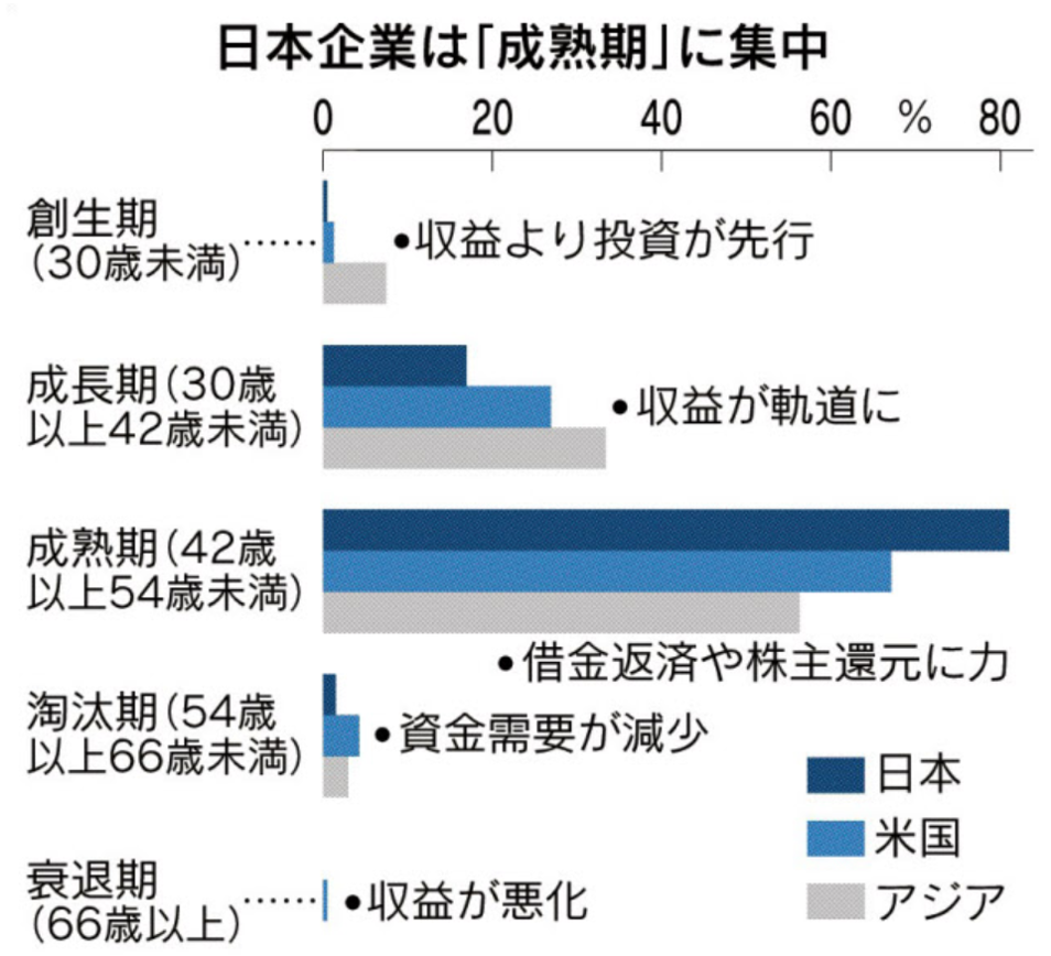 いずれにしても、日本は成熟期(42~54歳)の企業が全体の8割を占めており、米国やアジアと比較して成熟期に企業が集中していることがわかります。