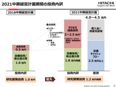 日立製作所(以下日立)が攻めに転じます。2019年6月に発表された中期経営計画で今後3年間でM&Aや研究開発、設備投資に合計約4.5兆円を向けるとしています。日経新聞の報道によれば、投資資金の原資は、営業キャッシュフローで2.5兆円、非中核事業や持ち合い株式の売却で8000億円、現預金2000億円、残りの1兆円は借入や社債のようです。