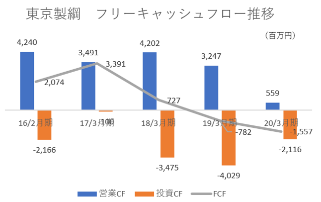 また、キャッシュフローについては、過去3年間、投資が先行しているものの(投資CFマイナス)、営業CFに結びついておらず、フリーキャッシュフロー(FCF)は2期連続マイナスです。言ってみれば、黄色信号がともっています。東京製綱は、2021年3月期の業績見通しを開示していませんが、第二四半期の業績(6ヵ月累計)は、売上高25,588百万円(前期比△17.4%)、営業利益は△867百万円と前期比大幅な赤字計上となっています。営業CFは214百万円となんとか黒字を確保したものの、通年では営業CFはマイナスになる可能性があります。