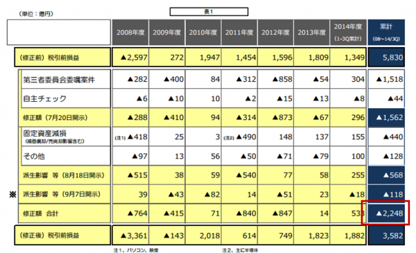 粉飾はかなり以前からあったようで2014年度は第三四半期までですが、およそ7年にわたって修正しています。東芝の開示資料「過年度決算の修正、2014年度決算の概要及び第176期有価証券報告書の提出ならびに再発防止策の骨子等についてのお知らせ」によれば、下図にある通り、7年間で税前利益を2,248億円粉飾していることがわかります。