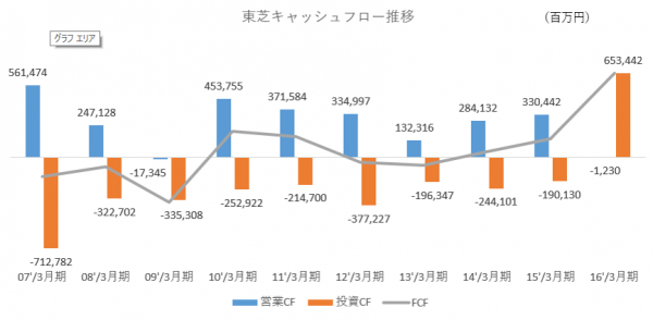 東芝の過去10年のキャッシュフローを見てみましょう。足元の2016年3月期では、営業CFは▲1,230百万円となっています。営業CFがマイナスというのは、成熟ステージにある東芝にとっては危機的状況です。投資CFがプラスになっているのは、6,384億円で東芝メディカルシステムズの株式を売却しているからです。これがなかったら、FCF(=営業CF+投資CF)は、マイナスです。
