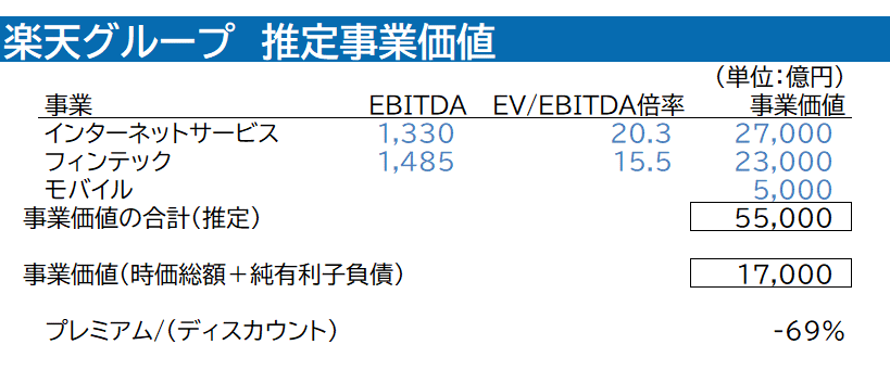 まず、QUICK・ファクトセットの予想を使って、今期のインターネットサービス、フィンテックのEBITDA(利払い・税引き・償却前利益)をそれぞれ1330億円、1485億円と試算しています。これに業界平均のEV(事業価値)/EBITDA倍率をかけて、事業価値を算出しています。問題は赤字のモバイル事業です。モバイル事業は、EV/売上高倍率で計算しており、それが約5000億円としています。3つの事業価値の合計5兆5000億円に対して、直近の時価総額をベースに試算した事業価値が1.7兆円なので、3事業の合計価値に比べ6割強低い、つまりコングロマリット・ディスカウントなのだということです。