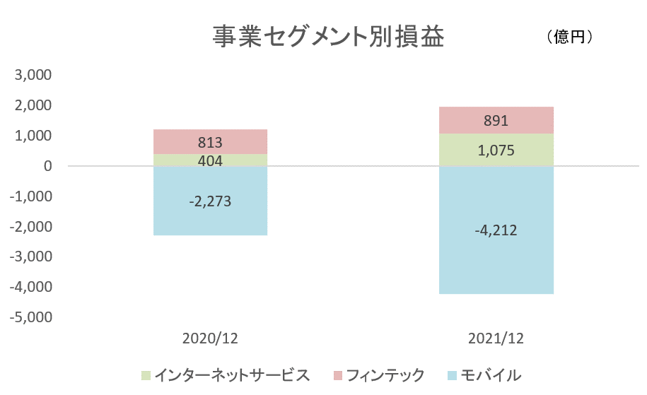 これは、モバイル事業が大きく足を引っ張っていることが原因です。下図はセグメント別の損益です。2021年12月期では、モバイル事業の損益は、なんと△4,212億円もの赤字となっていることがわかります。