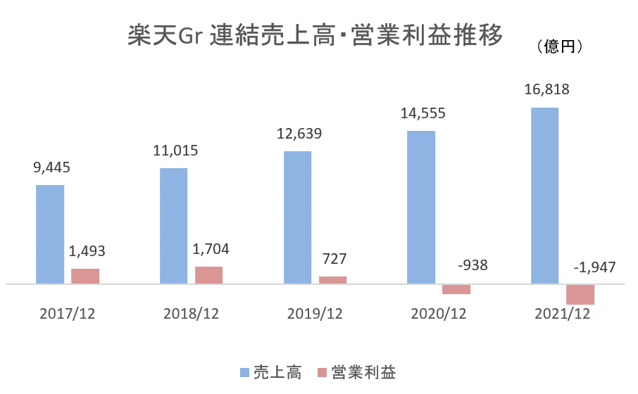 2022年3月25日付日経新聞「楽天、複合経営で企業価値目減り 脱割安株へ銀行上場カギ」で楽天グループの株価がふるわないことが取り上げられています。その原因は、コングロマリット・ディスカウントだというのです。まずは楽天の足元の業績をみてみましょう。
