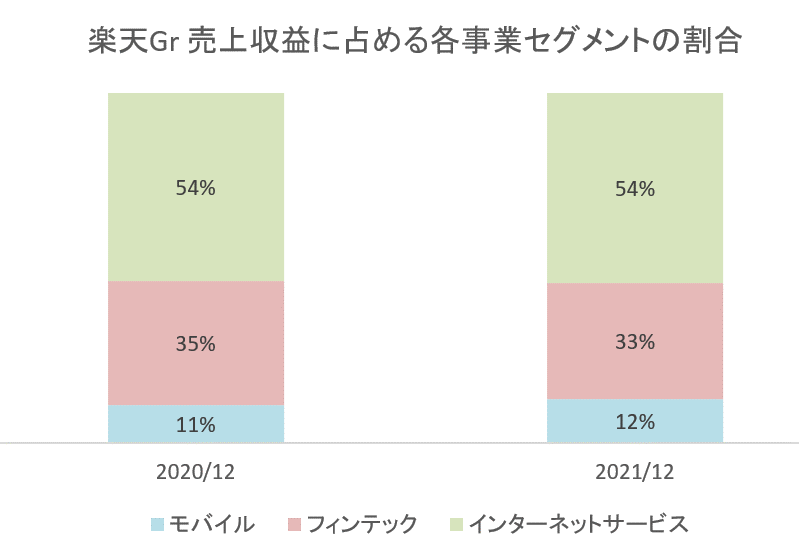 楽天と言えば、「楽天市場」というECサイトが創業事業ですが、2003年のDLJディレクト証券(現楽天証券)買収を皮切りに、楽天カード、楽天銀行、楽天生命保険と金融事業を拡大してきました。そして、今やモバイル事業(楽天モバイル)にも参入しています。足元での事業セグメント別の売上高をみるとインターネットサービスの割合は54%、金融事業(フィンテック)は33%、モバイルは12%となっています(下図)。