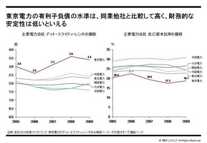これを見てみると、東京電力が同業他社と比較して頭ひとつ抜きん出て有利子負債の水準が高く、財務的な安定性に劣ることがわかります。