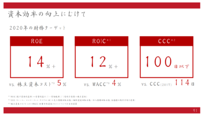 ROEで14パーセント以上、ROICで12パーセント以上、CCC(キャッシュ・コンバージョン・サイクル)を100日以下に設定しています。
