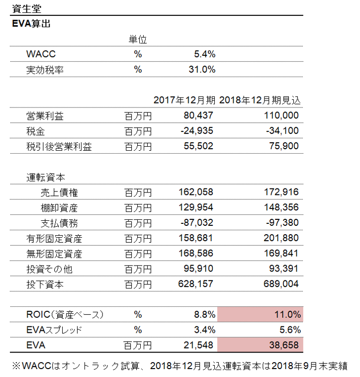 それでは、実際の資生堂のROICはどうなっているのでしょうか。資生堂は今回の決算発表で、通期の営業利益予想額を1,100億円のまま修正していません。そこでその営業利益を使い、運転資本は9月末実績の数字を使って私たちで試算してみました。その結果、2018年12月期の資生堂のROICは11%の見込みとなりました。