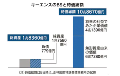この記事の中で、キーエンスの時価総額の10兆8千億円(8日時点)は「成長性(将来の利益)から見た企業価値」の部分4兆1千億円と「無形資産が由来の価値(無形資産含み益)」の部分6兆7千億円に分解できるとしています。